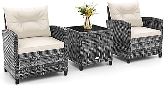 RELAX4LIFE 3 Pieces Outdoor Rattan Bistro Set, Patio Wicker Conversation Furniture Set with Cushions & Tempered Glass Tabletop, Metal Frame Garden Conservatory Sofa Table for Porch Balcony (White) |